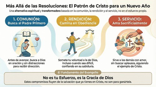 El patrón de Cristo ofrece esperanza real para quienes están cansados de resoluciones fallidas. No se trata de esfuerzo humano sino de rendición divina. No se trata de listas interminables de propósitos sino de un solo enfoque: moverse hacia el Padre antes de avanzar en cualquier dirección. Cuando esa prioridad está en su lugar, la obediencia fluye naturalmente y el servicio se convierte en gozo.