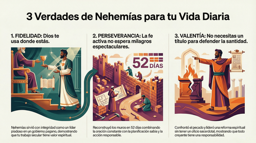 La historia de Nehemías deja tres palabras clave que pueden cambiar la perspectiva de cualquier creyente sobre su vida y su llamado. La primera palabra es fidelidad. Dios usa a las personas donde están, aunque sea un ambiente secular o aparentemente alejado del «ministerio». El trabajo de cada día puede ser adoración cuando se hace con excelencia para la gloria de Dios.